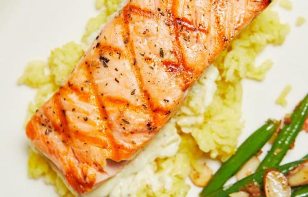 marinated & grilled salmon| cilantro beurre blanc| saffron risotto| green beans